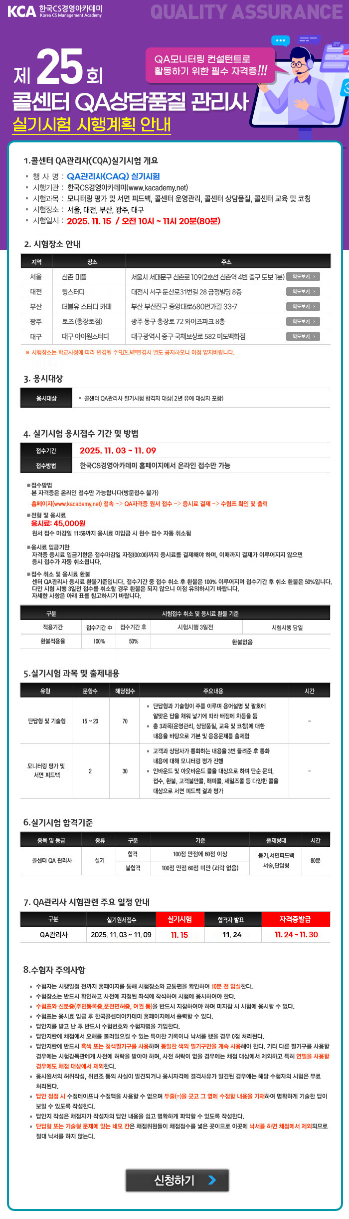 | 제목 | 제 25회 콜센터QA관리사 실기시험 시행안내[11월 15일] |