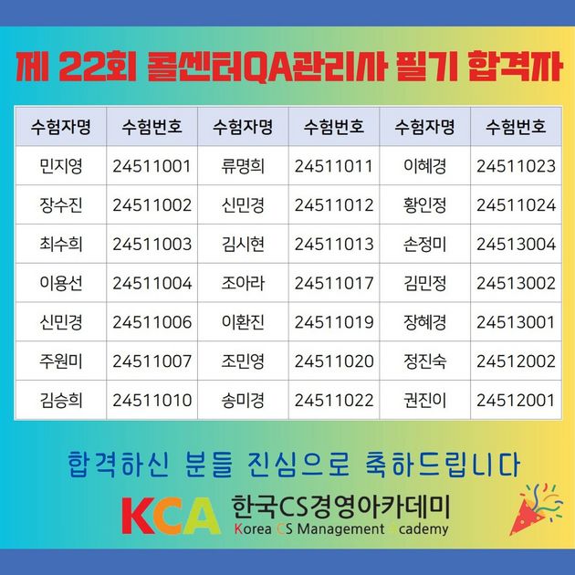 아래는 제 22회 콜센터 QA관리사 필기시험 합격자입니다. 수험번호를 확인하여 주시기 바랍니다. 합격하신 분들 진심으로 축하드립니다.