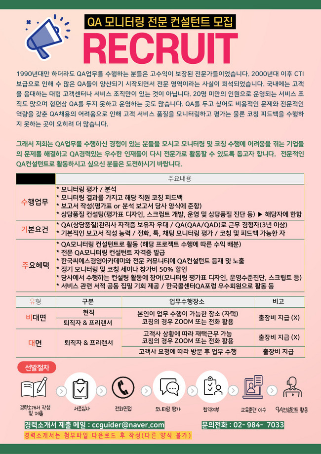 | 제목 | QA모니터링 전문 컨설턴트를 모십니다. |